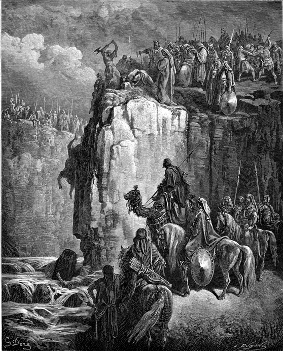 Description: Elijah orders the death of all the prophets of Baal after achieving victory in the contest at Mt. Carmel. The artist, Gustave Doré (1832-1883), has placed his signature at the lower left of the woodcut, and the engraver’s signature, L. Dumont, is located at the lower right.
