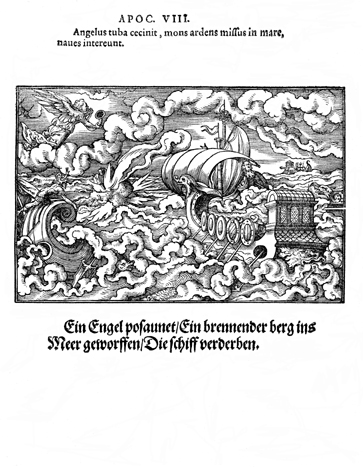 Description: An angel sounds the second trumpet and causes a huge mountain to ignite with fire and destroy a third of the sea and ships.