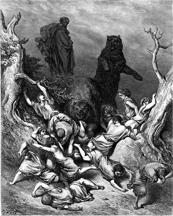 Description: After Elisha pronounces a curse on youths who mock him, two bears come from the woods to maul the 42 youths. The artist, Gustave Doré (1832-1883), has placed his signature at the lower left of the woodcut, and the engraver’s signature, Antoine Alphée Piaud (1813-1867), is located at the lower right.
