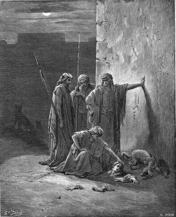 Description: Jezebel's hands, head, and feet are all that remain after her body was ravaged by dogs. The artist, Gustave Doré (1832-1883), has placed his signature at the lower left of the woodcut, and the engraver’s signature, Héliodore Pisan (1822-1890), is located at the lower right.