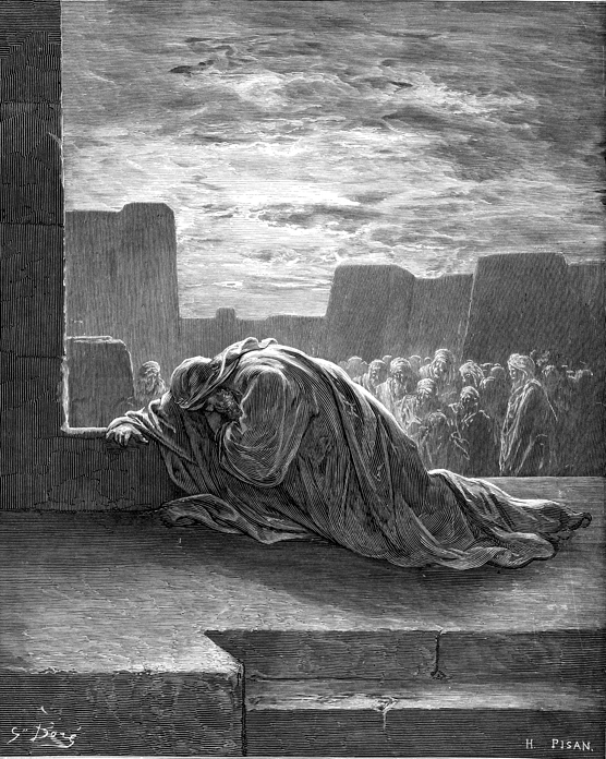 Description: Ezra prays before the new temple. The artist, Gustave Doré (1832-1883), has placed his signature at the lower left of the woodcut, and the engraver’s signature, Héliodore Pisan (1822-1890), is located at the lower right.