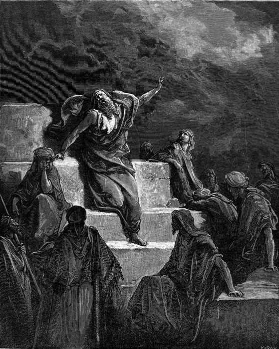 Description: A depiction of the prophet Jeremiah. The artist, Gustave Doré (1832-1883), has placed his signature at the lower left of the woodcut, and the engraver’s signature, Laurent Hotelin, is located at the lower right.