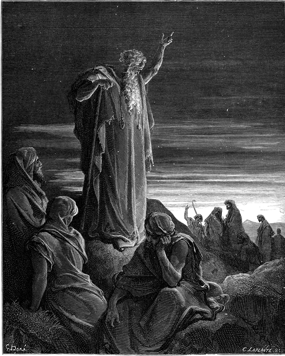 Description: The prophet Ezekiel speaks to the people. The artist, Gustave Doré (1832-1883), has placed his signature at the lower left of the woodcut, and the engraver’s signature, Charles Laplante (d. 1903), is located at the lower right.