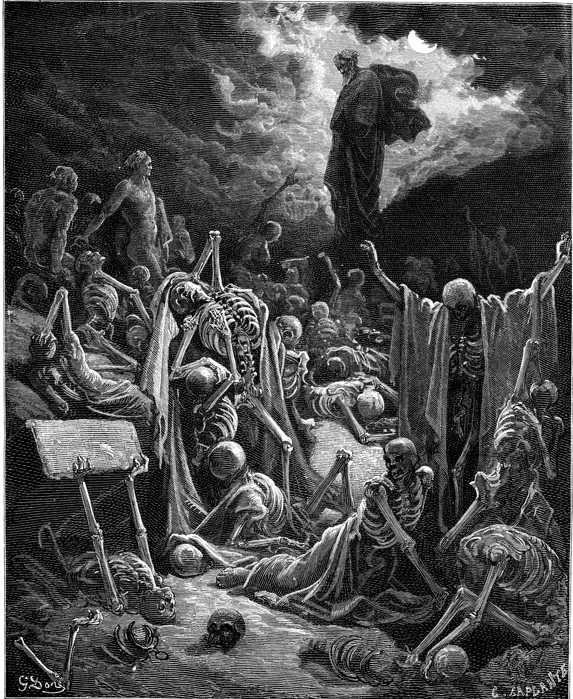 Description: Ezekiel's vision of the valley of dry bones. Ezekiel commands the dry bones to come to life. The artist, Gustave Doré (1832-1883), has placed his signature at the lower left of the woodcut, and the engraver’s signature, Charles Laplante (d. 1903), is located at the lower right.
