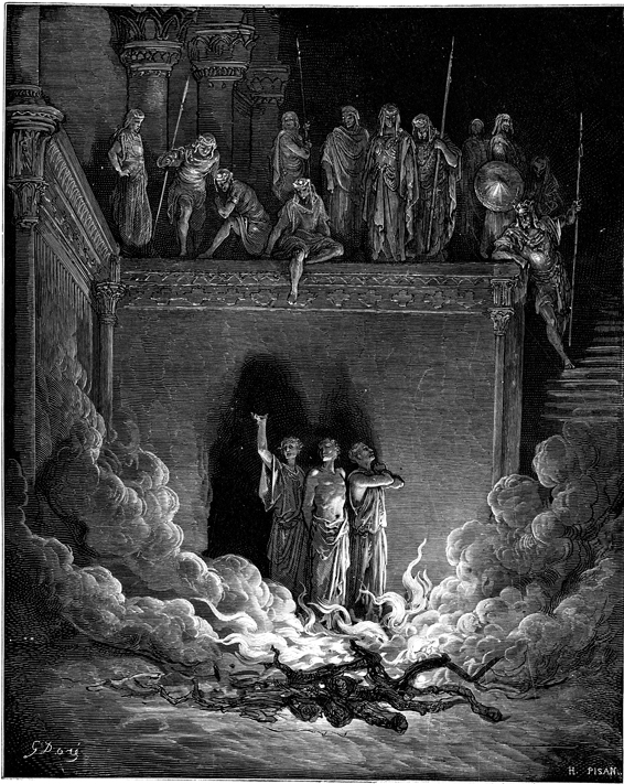 Description: Nebuchadnezzar has Shadrach, Meshach, and Abednego thrown into the fiery furnace for not bowing to the idol, but an angel appears to protect them. The artist, Gustave Doré (1832-1883), has placed his signature at the lower left of the woodcut, and the engraver’s signature, Héliodore Pisan (1822-1890), is located at the lower right.