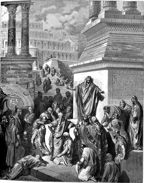 Description: The people of Nineveh repent as Jonah preaches. The artist, Gustave Doré (1832-1883), has placed his signature at the lower left of the woodcut, and the engraver’s signature, A. Ligny, is located at the lower right.