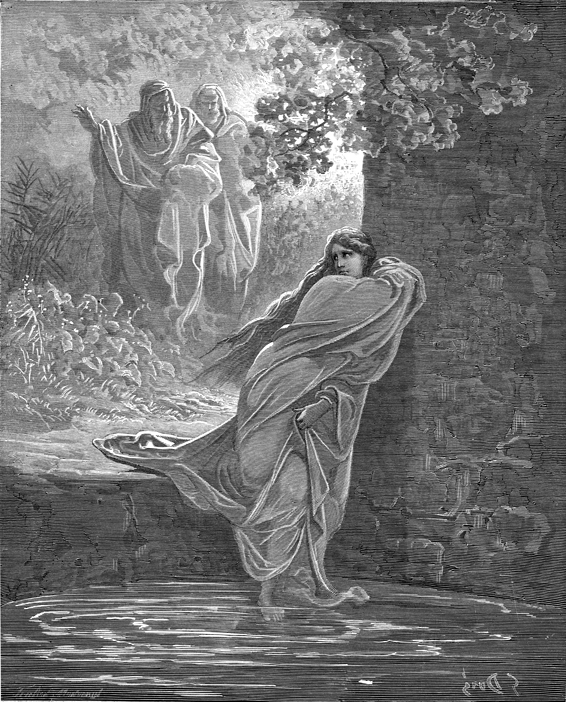 Description: Two elders demand that Susanna have sex with them as she bathes. The artist, Gustave Doré (1832-1883), has placed his signature at the lower left of the woodcut, and the engraver’s signature, Trichon Monvoisin, is located at the lower right.