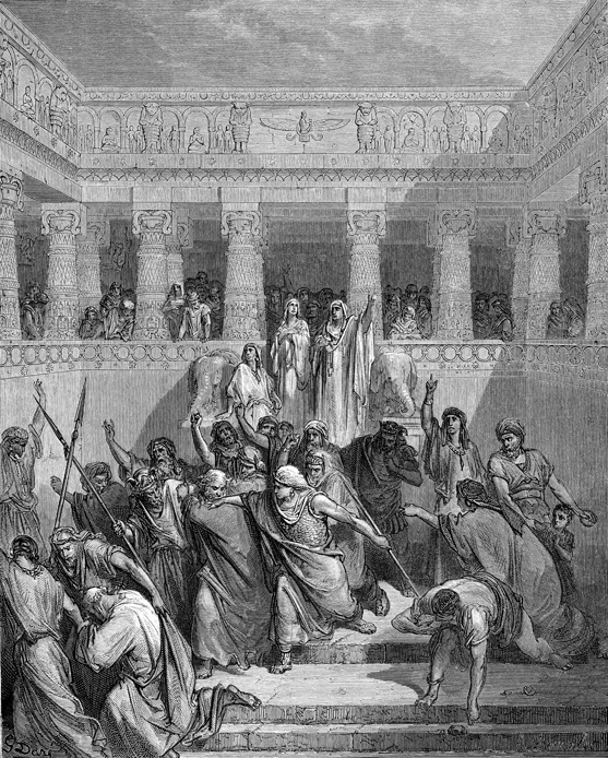 Description: Daniel orders that the elders be taken away and stoned for testifying falsely against Susanna. The artist, Gustave Doré (1832-1883), has placed his signature at the lower left of the woodcut, and the engraver’s signature, A. Demarle, is located at the lower right.