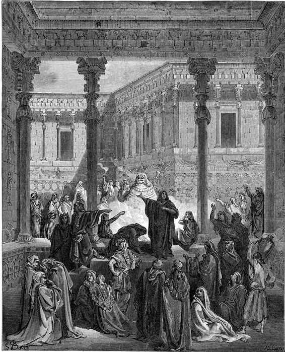 Description: Daniel proves that Bel is a false god. The artist, Gustave Doré (1832-1883), has placed his signature at the lower left of the woodcut, and the engraver’s signature, A. Ligny, is located at the lower right.