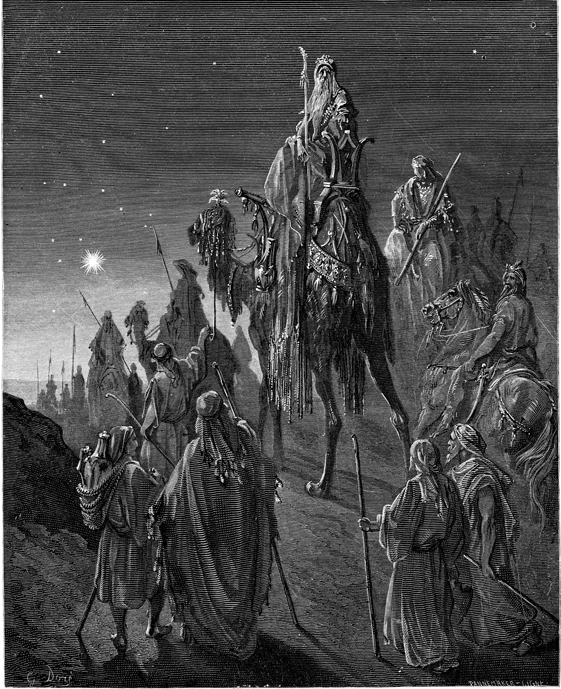 Description: Three wise men follow the star to Jesus. The artist, Gustave Doré (1832-1883), has placed his signature at the lower left of the woodcut, and the engravers’ signatures, Adolphe François Pannemaker (1822-1900) and A. Ligny, are located at the lower right.