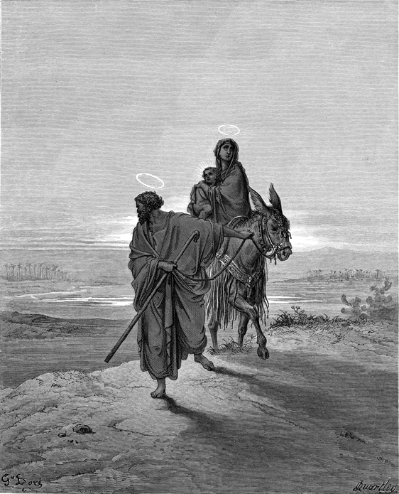 Description: Joseph and Mary take the baby Jesus to Egypt. The artist, Gustave Doré (1832-1883), has placed his signature at the lower left of the woodcut, and the engraver’s signature, John Quartley, is located at the lower right.