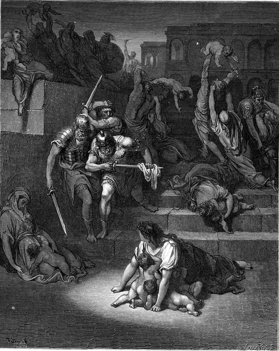 Description: Herod's soldiers murder all the male children two years of age and younger in the vicinity of Bethlehem. The artist, Gustave Doré (1832-1883), has placed his signature at the lower left of the woodcut, and the engraver’s signature, Charles Laplante (d. 1903), is located at the lower right.