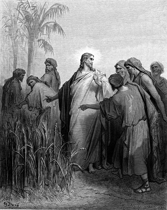 Description: The Pharisees challenge Jesus over allowing his disciples to pick grain on the Sabbath. The artist, Gustave Doré (1832-1883), has placed his signature at the lower left of the woodcut, and the engraver’s signature, Adolphe François Pannemaker (1822-1900), is located at the lower right (the addition of “-Doms” may indicate a co-engraver).