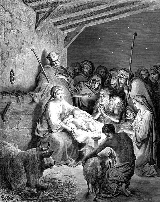 Description: Shepherds visit the newborn Jesus after learning of his birth from an angel. The artist, Gustave Doré (1832-1883), has placed his signature at the lower left of the woodcut, and the engraver’s signature, L. Chapon, is located at the lower right.