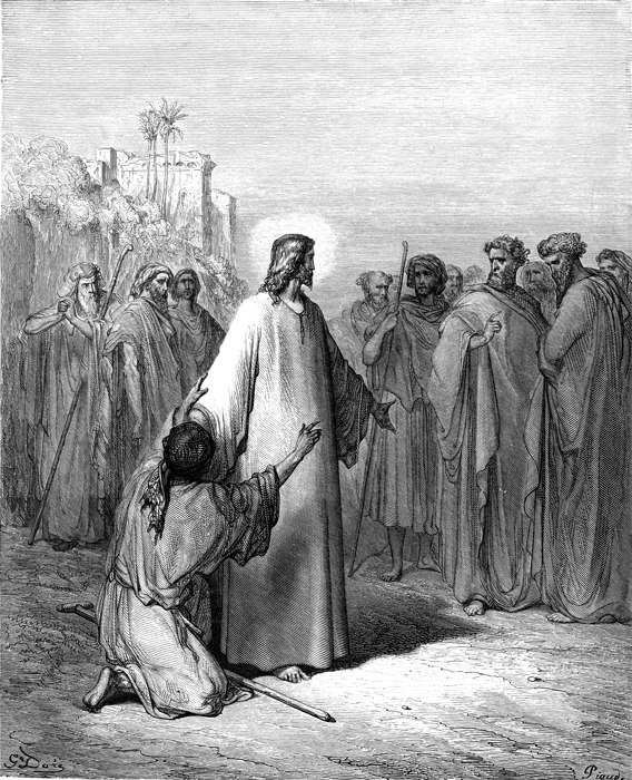 Description: Jesus heals a demoniac. The artist, Gustave Doré (1832-1883), has placed his signature at the lower left of the woodcut, and the engraver’s signature, Antoine Alphée Piaud (1813-1867), is located at the lower right.