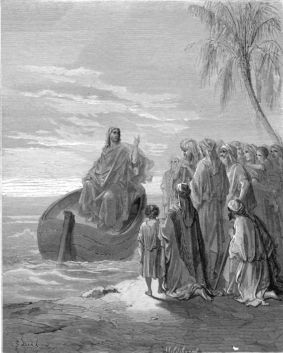 Description: Jesus teaches the crowd from a boat. The artist, Gustave Doré (1832-1883), has placed his signature at the lower left of the woodcut, and the engraver’s signature, Henri Théophile Hildibrand, is located at the lower right.