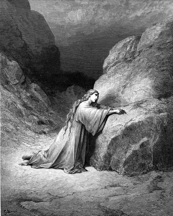 Description: A depiction of the repentant Mary Magdalene. The artist, Gustave Doré (1832-1883), has placed his signature at the lower left of the woodcut, and the engraver’s signature, Adolphe François Pannemaker (1822-1900), is located at the lower right.