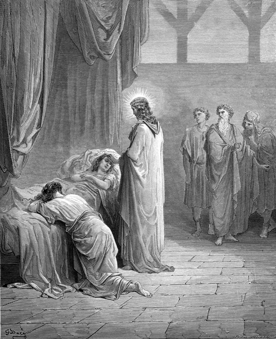 Description: Jesus raises Jairus' daughter from the dead. The artist, Gustave Doré (1832-1883), has placed his signature at the lower left of the woodcut, and the engraver’s signature, Trichon Monvoisin, is located at the lower right.
