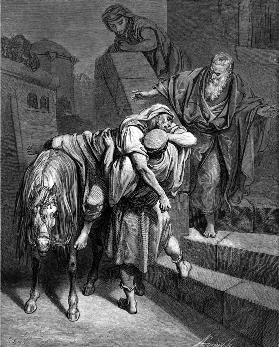 Description: The Good Samaritan takes the wounded into the inn at Jericho. The artist, Gustave Doré (1832-1883), has placed his signature at the lower left of the woodcut, and the engraver’s signature, Adolphe Gusmand (1821-1905), is located at the lower right.
