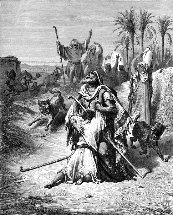 Description: The father embraces his son upon his return home. The artist, Gustave Doré (1832-1883), has placed his signature at the lower left of the woodcut, and the engraver’s signature, Jules Fagnion, is located at the lower right.