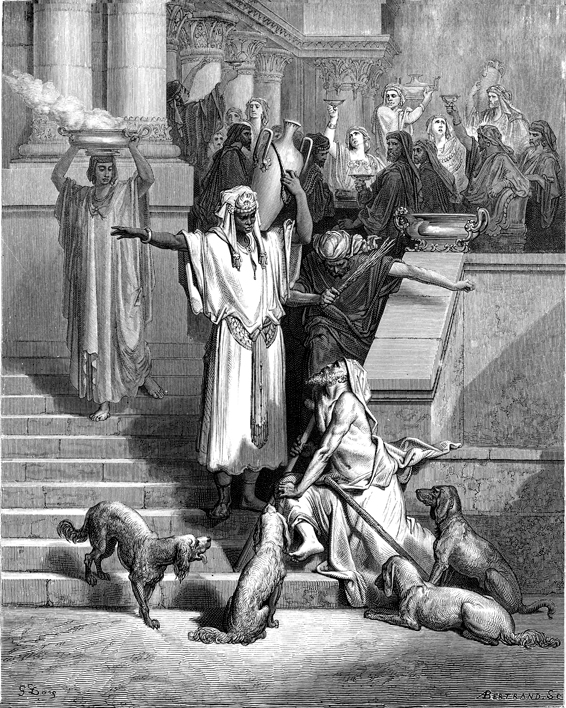 Description: Lazarus sits at the gate of the rich man, who lives in luxury. The artist, Gustave Doré (1832-1883), has placed his signature at the lower left of the woodcut, and the engraver’s signature, Antoine Valérie Bertrand, is located at the lower right.