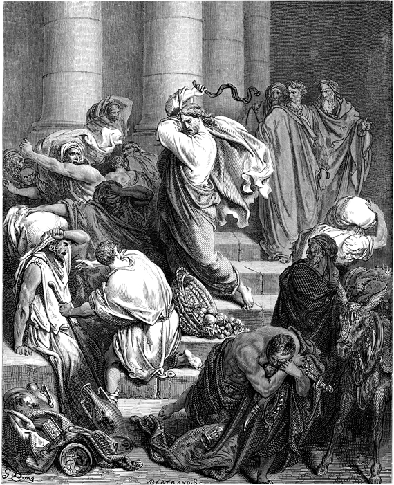 Description: Jesus drives the merchants out of the temple. The artist, Gustave Doré (1832-1883), has placed his signature at the lower left of the woodcut, and the engraver’s signature, Antoine Valérie Bertrand, is located at the lower right.