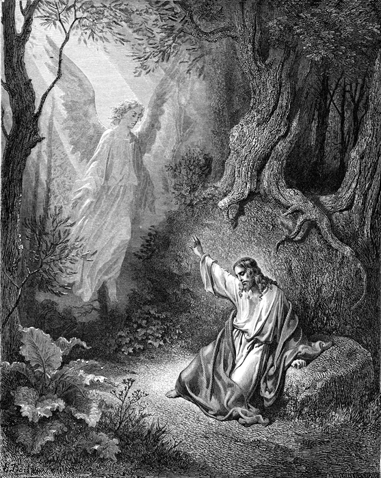 Description: Jesus prays in the Garden of Gethsemane and an angel ministers to him. The artist, Gustave Doré (1832-1883), has placed his signature at the lower left of the woodcut, and the engravers’ signatures, Adolphe François Pannemaker (1822-1900) and A. Ligny, is located at the lower right.