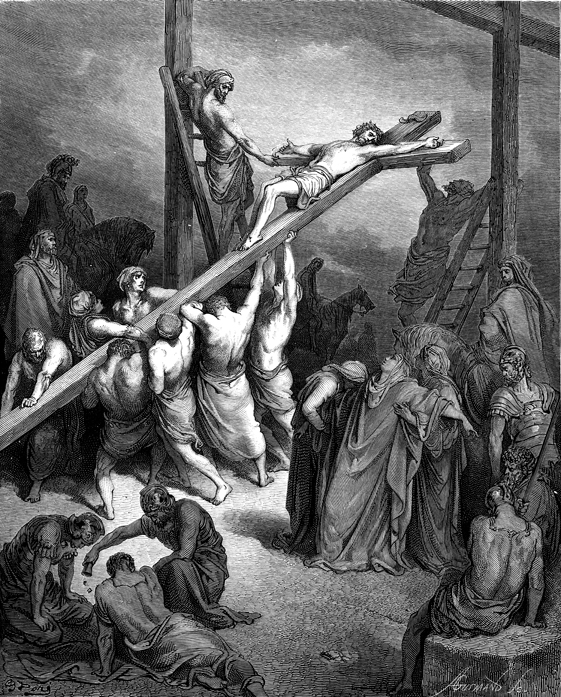 Description: Jesus' cross is raised as Roman soldiers gamble for his clothes. The artist, Gustave Doré (1832-1883), has placed his signature at the lower left of the woodcut, and the engraver’s signature, Adolphe Gusmand (1821-1905), is located at the lower right.