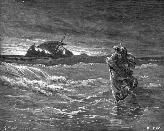 Description: Jesus wallks on water. The artist, Gustave Doré (1832-1883), has placed his signature at the lower left of the woodcut, and the engraver’s signature, Héliodore Pisan (1822-1890), is located at the lower right.