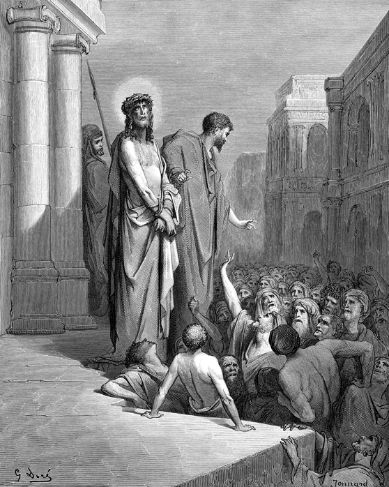 Description: Pontius Pilate presents Jesus before the people. The artist, Gustave Doré (1832-1883), has placed his signature at the lower left of the woodcut, and the engraver’s signature, Paul Jonnard-Pacel (d. 1902), is located at the lower.