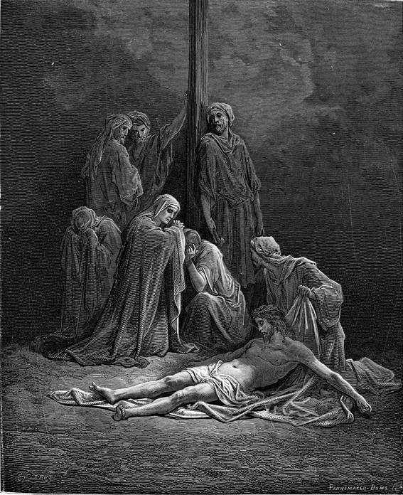 Description: Jesus' dead body is wrapped with a burial shroud. The artist, Gustave Doré (1832-1883), has placed his signature at the lower left of the woodcut, and the engraver’s signature, Adolphe François Pannemaker (1822-1900), is located at the lower right (the addition of “-Doms” may indicate a co-engraver).