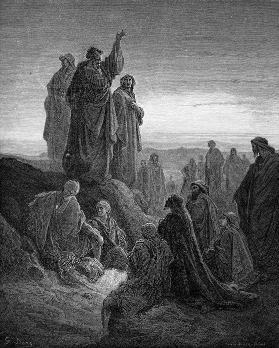 Description: Peter preaches the gospel to the crowd of nations on Pentecost. The artist, Gustave Doré (1832-1883), has placed his signature at the lower left of the woodcut, and the engraver’s signature, Adolphe François Pannemaker (1822-1900), is located at the lower right (the addition of “-Doms” may indicate a co-engraver).