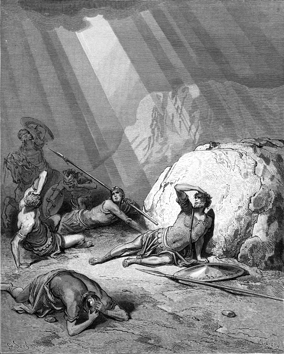 Description: Jesus, depicted as light from heaven, confronts Paul on the road to Damascus. The artist, Gustave Doré (1832-1883), has placed his signature at the lower left of the woodcut, and the engraver’s signature, A. Ligny, is located at the lower right.