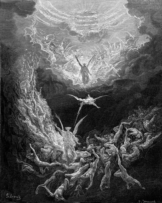 Description: A depiction of the final judgment. The saints are taken into heaven and the sinners are cast from heaven. The artist, Gustave Doré (1832-1883), has placed his signature at the lower left of the woodcut, and the engraver’s signature, Paul Jonnard-Pacel (d. 1902), is located at the lower right.