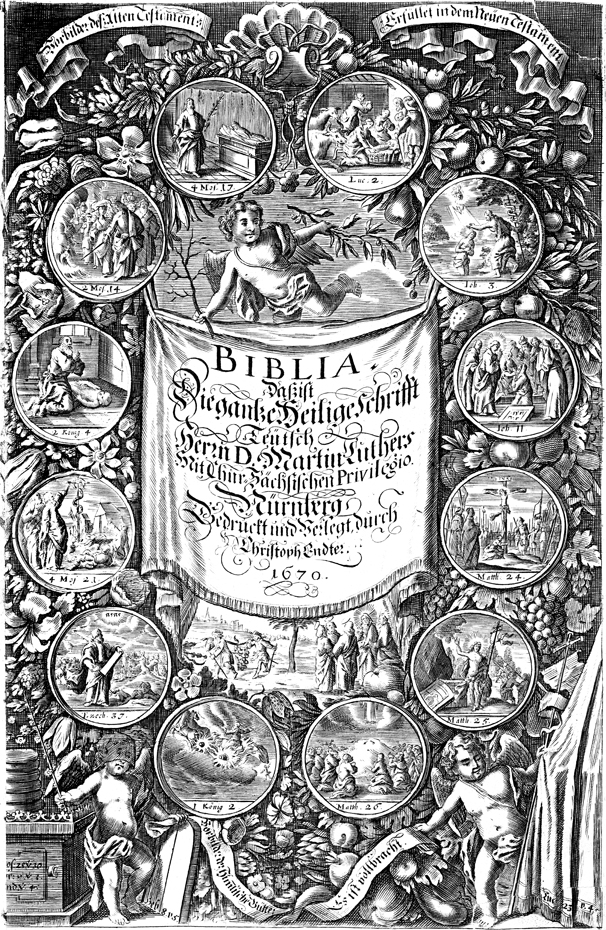 Description: On this title page, scenes from the Old and New Testaments with scripture references encompass a banner which gives the volume's title; many of the images hint toward a notion that the revelation in the Old Testament was partial and has found fulfillment in the New Testament (dry branch vs. leafy branch on the angel; veil vs. no veil on the bottom cherubs).