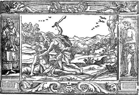 Description: Because Cain's offering was not as pleasing to the Lord as Abel's offering (right center, represented by the altars with contrasting smoke billows) Cain lunges at his brother, Abel, just before murdering him. The image is flanked by Aaron as priest (left) and Jesus as the Man of Sorrows. The monogram of the artist or engraver (LG) along with an engraver’s knife has been placed at the bottom left.