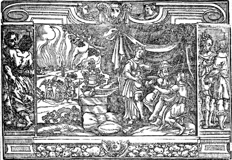 Description: As Sodom and Gomorrah burn and angels turn Lot's wife to stone, Lot's daughters get him drunk so they could lay with him and have children. The monogram of the artist or engraver (LG), along with an engraver’s knife, has been placed at the bottom right of the woodcut. The panel to the left depicts Jacob wrestling with the angel of God, while that on the right shows Jacob buying Esau’s birthright for a bowl of stew.