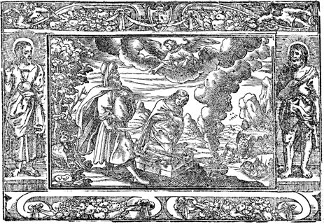 Description: After witnessing Abraham’s faith, an angel prevents him from sacrificing his son Isaac to God and supplies a ram instead for the sacrifice. The monogram of the engraver (VW) has been placed in the lower left portion of the woodcut. This image is flanked by Jesus holding an orb (left) and John the Baptist .