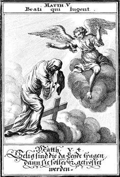 Description: As a woman weeps with cross by her side an angel comforts her. A rendering of the second beatitude: "Blessed are those who mourn, for they will be comforted" (NIV).