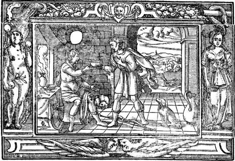 Description: Esau (right), famished by a recent hunting expedition, agrees to sell his birthright to Jacob for a bowl of stew and some bread. The artist’s or engraver’s monogram (LG) has been placed in the lower right corner of the woodcut above an engraver’s knife. Additionally, this image is flanked by Eve in the garden (left, serpent in the tree overhead) and a female figure, Ecclesia, representing the Church, with the Eucharistic chalice in one hand, the cross (perhaps alluding to John the Baptist as proto-evangelist) in the other, and the bronze serpent (cf. Numbers 21) lifted up overhead.