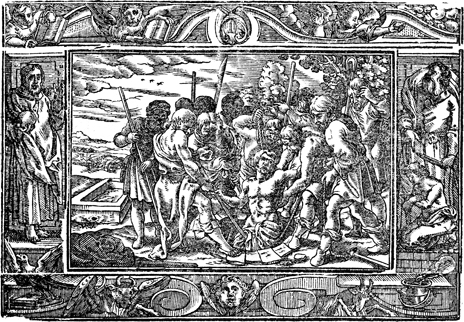 Description: Envious of their brother’s dreams, Joseph’s brothers lower him into a cistern before deciding to sell him to the Ishmaelites. The initials of the artist or engraver (VW) have been placed in the bottom-left corner. This image is flanked by Jesus holding an orb (left) and Abraham about to offer Isaac as a sacrifice. The symbols for the four Gospels are placed above (Matthew and Mark) and below (John and Luke) the left panel, while the angel (who prevented Abraham from slaying Isaac) and the ram and censer are shown above and below the right panel.