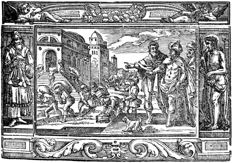 Description: During Egypt’s seven years of plenty, Joseph makes preparations for the seven years of famine by collecting and storing the surplus. This image if flanked by Aaron as priest (left) and Jesus as the Man of Sorrows. The artist’s or engraver’s initials (VW) have been placed in the lower right corner of the woodcut.