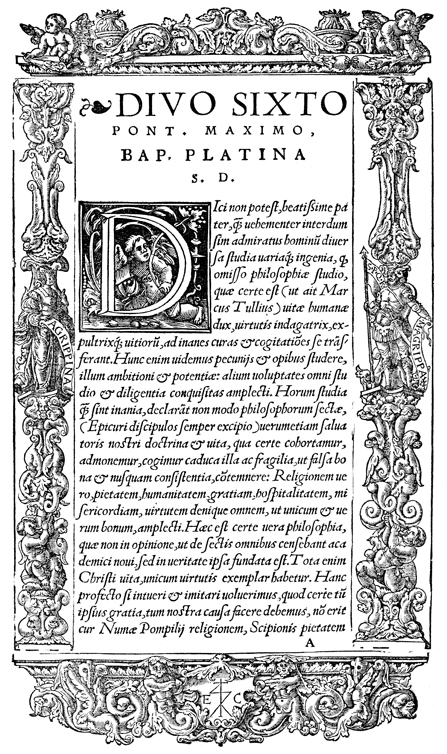 Description: This historiated page border features the Roman princess Agrippina (left) and her father Agrippa, a Roman statesman, who is holding a banderole with the Latin inscription SPQR (The senate and the people of Rome). The monogram (EC)of the artist or engraver is located at the bottom center, and the border surrounds a portion of text which features an initial letter D with a cherub.