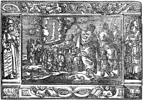 Description: When the people of Israel left Egypt, they followed a pillar of cloud. The initials of the artist or engraver (VW) have been placed to the left. The image is flanked by Moses with the Ten Commandments (left) and Aaron as priest.