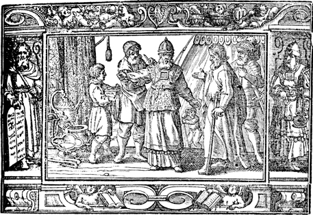 Description: Aaron and his sons are measured for new priestly clothing made of fine yarns and linens. The image is flanked by Moses holding the Ten Commandments (left) and Aaron as priest.