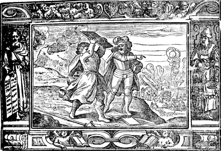 Description: After receiving the Ten Commandments from God on stone tablets, Moses and Joshua come down from Mount Sinai to see the Israelite camp worshipping a golden calf. Consumed by anger, Moses throws down the tablets where they break at the foot of the mountain. The initials of the artist or engraver Paul Creutzberger (PC) have been placed in the bottom-center. The image is flanked by Moses with the Ten Commandments (left) and Aaron as priest.