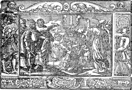 Description: The Israelite camp is roused by the two silver trumpets of the priests to depart from Sinai and follow the pillar of cloud towards the Wilderness of Paran. The initials of the artist or engraver (VW) have been placed in the bottom-left. The image is flanked by Goliath (left) and the young David.