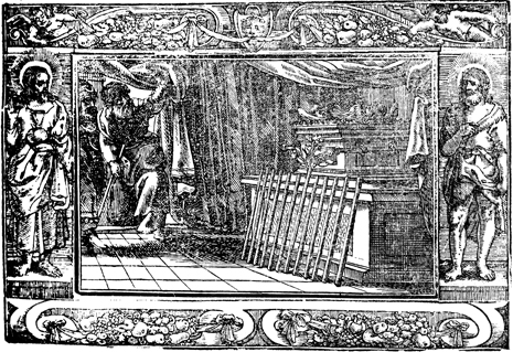 Description: Moses places the staff of each tribe in the tent of the covenant for the night. He returns the next day to find that the Lord has caused Aaron's to sprout leaves and flowers, thus confirming his priesthood over the other tribes. The image is flanked by Jesus holding an orb (left) and John the Baptist in animal skins.