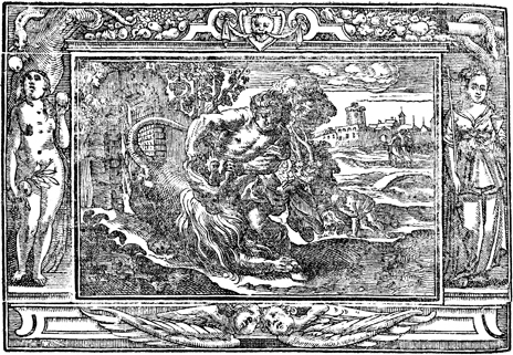 Description: Samson wrestles with a lion, killing it with his bare hands. The initials of the artist or engraver (VW) have been placed in the bottom-left. The image is flanked by Eve in the garden (left) and an allegorical figure representing the Church.