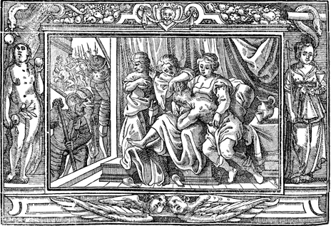 Description: While Samson sleeps on Delilah's lap, a man shaves his head and several Philistine soldiers prepare to seize him. The initials of the artist or engraver Paul Creutzberger (PC) have been placed to the right. The image is flanked by Eve in the garden (left) and an allegorical figure representing the Church.
